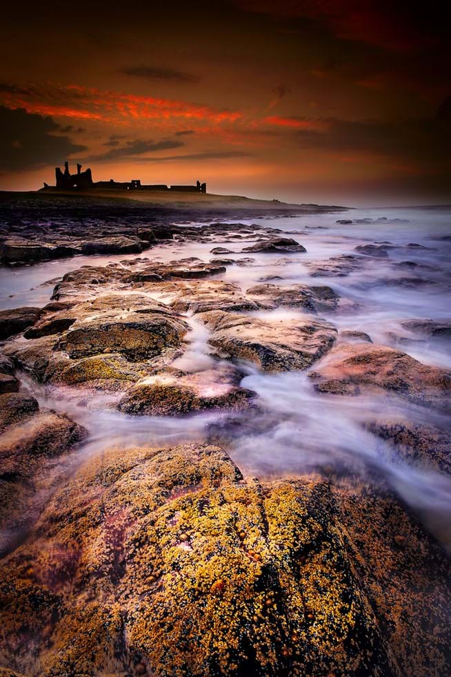 Stunning sunset seen from the rocks leading to Dunstanburgh Castle with the wash of the incoming tide running through the speckled rocks